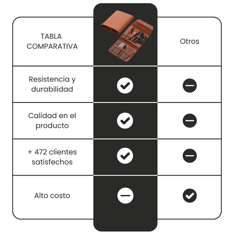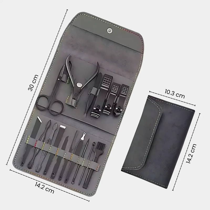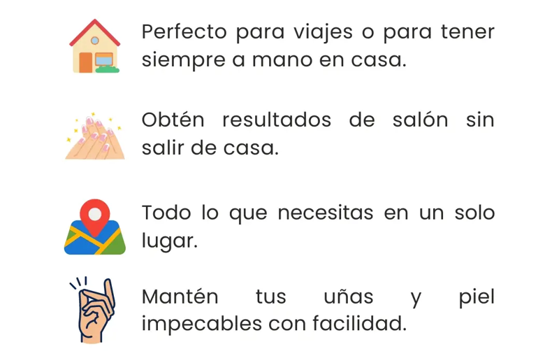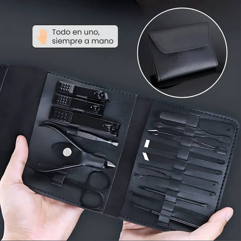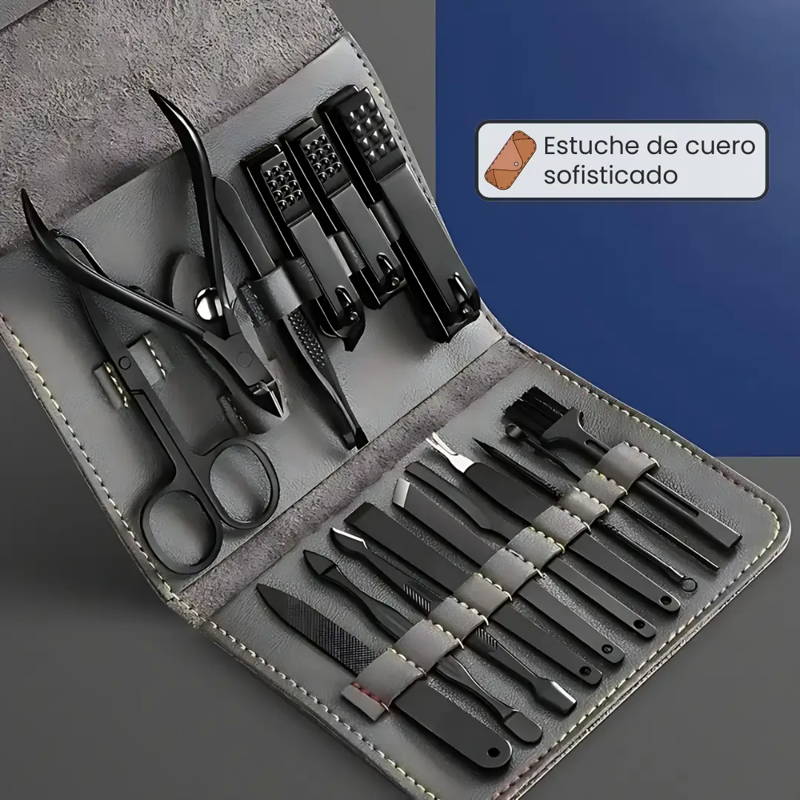 Imagina tener todo lo necesario para mantener tus manos y pies impecables, listos para cualquier ocasión, todo en un elegante estuche de cuero que puedes llevar a donde vayas.